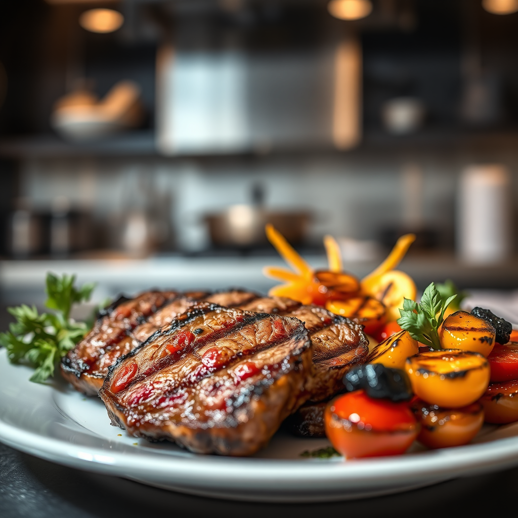 A luxurious Michelin kitchen setting showcases a beautifully arranged plate featuring succulent grilled beef and an array of vibrant grilled vegetables. The scene is captured with expert studio lighting that highlights the textures and colors, emphasizing an ultra-detailed presentation. The depth of field adds a layer of artistry, drawing attention to the exquisite details of the perfectly charred meat and glistening vegetables, evoking a sense of gourmet indulgence and culinary elegance.