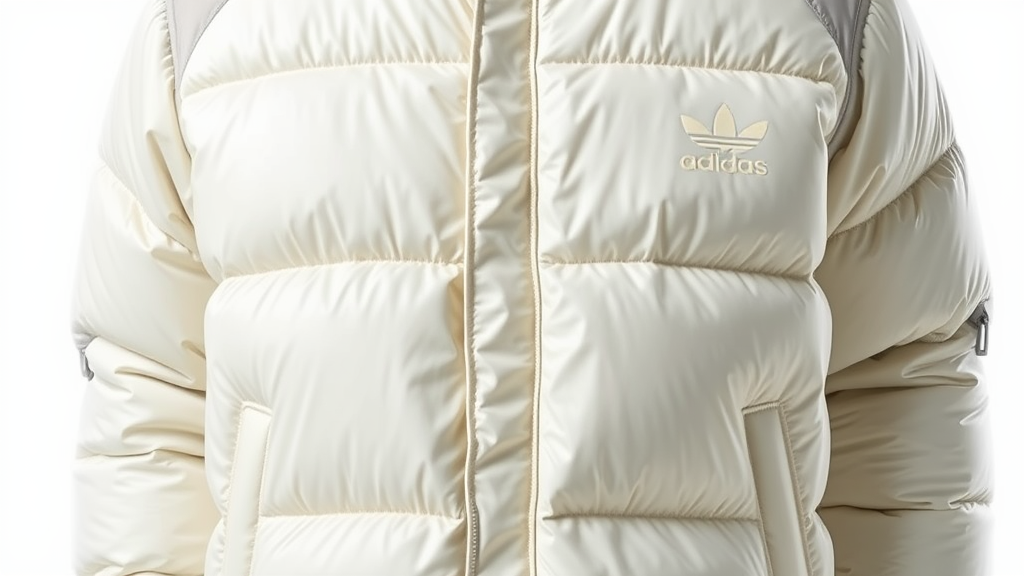A luxurious milky-hued Adidas winter puffer jacket, embodying a contemporary design trend with influences from Kanye West. The jacket features intricate and detailed textures, enhanced by an octane finish, displayed against a pristine white background. Captured in stunning 4K resolution, the piece embraces both innovation and high fashion aesthetics.