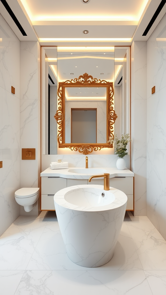 A luxurious modern bathroom interior unfolds from a front-view perspective, showcasing an exquisite white marble sink that serves as the focal point. Accompanied by a sleek matte gold faucet, the sink exudes elegance. Nearby, a wall-mounted toilet crafted from pristine white ceramic complements the sophisticated ambiance of the space. A large mirror with an ornate gold filigree frame magnificently reflects the opulent decor throughout the room. The floor and walls are adorned with expansive tiles of white marble, subtly veined with gray, enhancing the lavish aesthetic. Soft, integrated LED lighting is strategically placed within the ceiling and behind the mirror, emitting a warm, inviting glow that suffuses the room in serenity and opulence. The design skillfully balances warm artificial light with natural daylight, highlighting the polished surfaces and refined lines emblematic of luxury bathroom design. Small artistic flourishes, such as a minimalistic potted plant or a plush, folded towel, subtly accent the space, enhancing its serene yet lavish atmosphere.