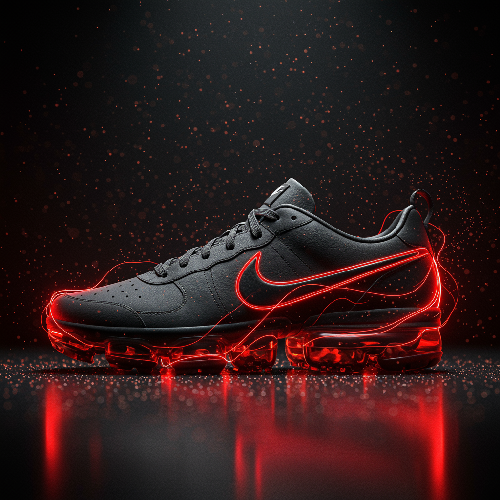 A luxurious Nike sneaker design featuring subtle red energy wisps gently flowing along the edges, hinting at an initial particle formation. This premium product shot employs perfect lighting to accentuate the ultra-detailed materials. The scene is set against a dark background with precision spotlights, creating a mesmerizing volumetric atmosphere with tiny floating micro particles adding depth. The overall composition is elegant and dynamic, capturing the essence of high-end sneaker innovation in a sleek and polished presentation, inviting viewers into a world of opulent design and cutting-edge technology.