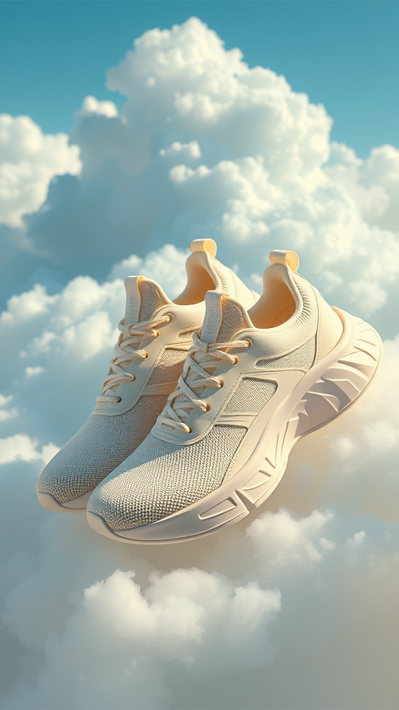 A luxurious pair of cream-colored running sneakers designed by Kanye West and Jacquemus, exuding elegance and sophistication. The sneakers are set against a backdrop of fluffy, ethereal blue clouds, accentuated by gentle volumetric lighting that highlights their intricate and high-detail design. Rendered in stunning octane clarity, the sneakers boast a unique mix of premium materials and exquisite craftsmanship. The product shot captures the essence of opulence and style, presented in breathtaking 8k resolution, offering a creatively refined take on modern luxury footwear.