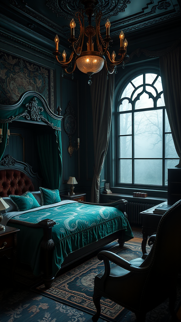 A luxurious Slytherin-style bedroom, enveloped in deep emerald green and silver hues, features a grand four-poster bed with plush velvet curtains and a serpentine-patterned duvet. Rich, dark wood furnishings include a stately wardrobe and a polished writing desk adorned with antique silver accents. Dimly lit by an ornate chandelier, the room is embellished with gothic-style tapestries and shimmering snake-shaped sconces on the walls, casting soft, mysterious shadows. A large window draped with heavy silken curtains reveals a glimpse of a misty, moonlit forest, providing a tranquil yet enigmatic atmosphere. In the corner, a cozy reading nook with a high-backed leather chair and a small bookshelf brimming with ancient tomes invites introspection and study.