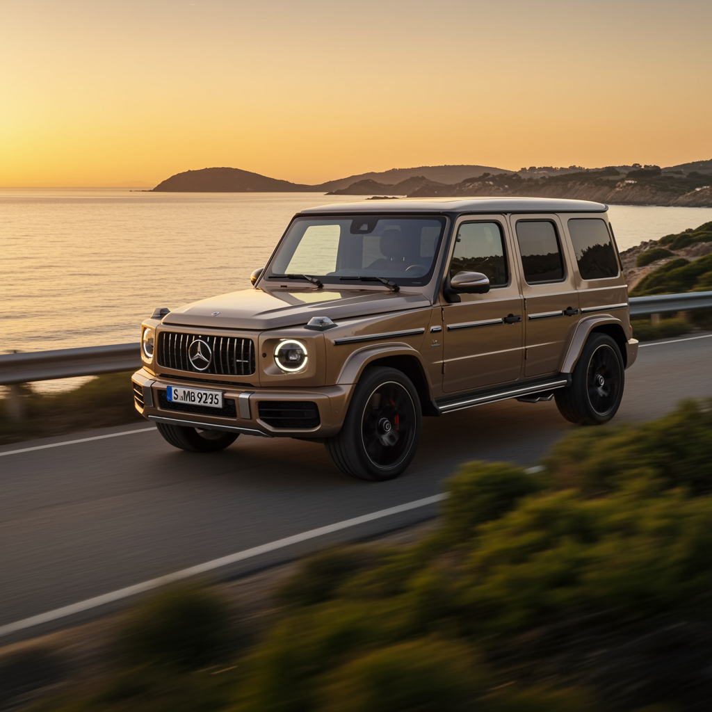 A luxurious sunset-hued Mercedes AMG G 63 gliding through a scenic coastal road, reflecting the warm golden tones of the setting sun, against the backdrop of a picturesque seaside landscape, lush greenery framing the scene.