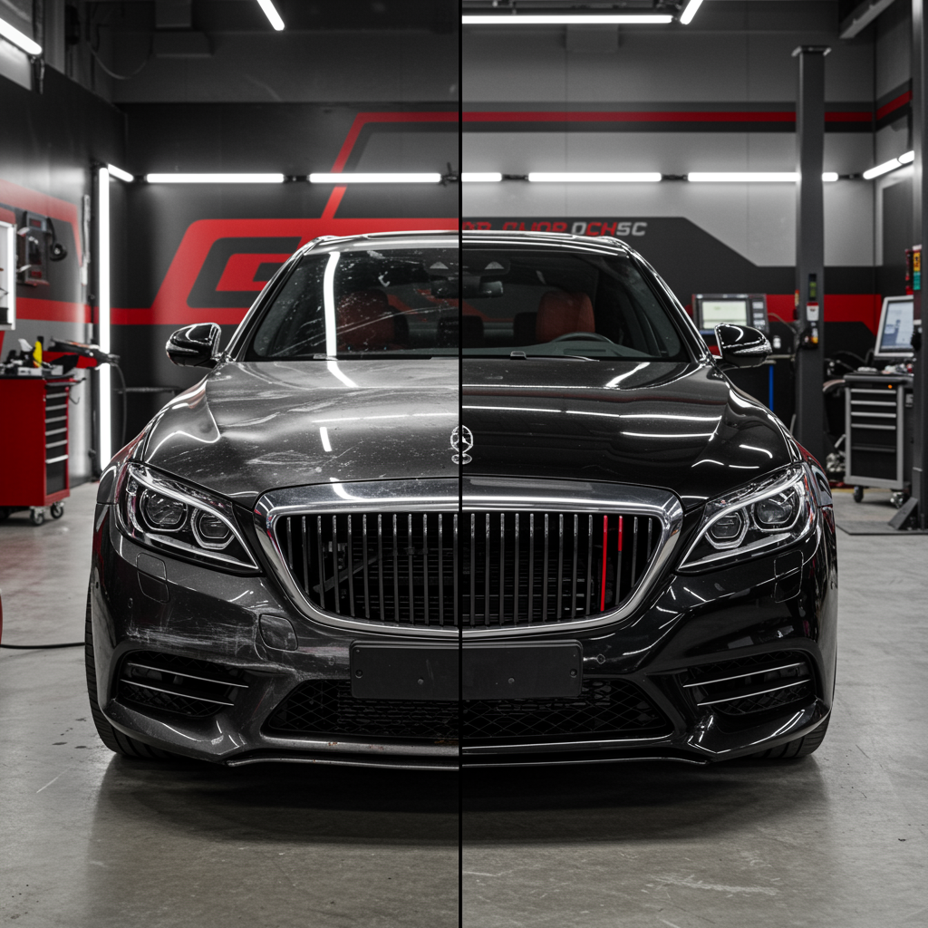 A luxury car, front-facing, with a dramatic split down the middle showcasing a before-and-after repair effect. The left side is visibly damaged, featuring prominent scratches, deep dents, a shattered bumper, and faded, matte black paint. The right side stands in stark contrast, fully restored, with a sleek, polished black surface accented by striking red and white detailing. This color palette of black, red, and white creates a modern and eye-catching aesthetic. In the background, a sophisticated car repair workshop is visible, adorned with matching black, red, and white accents on the walls and equipment. The workshop is immaculate, reflecting the high standards of craftsmanship. Lighting is expertly balanced; reflective highlights dance across the polished surface on the restored side, while subdued lighting gently reveals the flaws on the damaged side. The overall scene is a photorealistic render, ultra-detailed, conveying a sense of luxury and modernity.