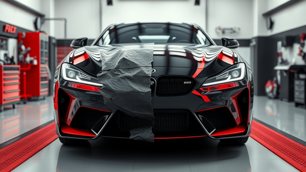 A luxury car is positioned front-facing with a distinct split down the middle, showcasing a clear contrast between the left and right sides. The left half of the car is visibly damaged, displaying deep scratches, noticeable dents, a cracked bumper, and faded, dull paint. In contrast, the right half is meticulously repaired, featuring a glossy, polished surface with vibrant colors. The car's main palette consists of a striking combination of black, red, and white, creating a bold and modern aesthetic. The surrounding environment is a professional car repair workshop with a sleek design, incorporating black, red, and white accents in the walls, tools, and equipment. The workshop is pristine and contemporary, highlighting high-quality craftsmanship. Lighting is carefully balanced, with bright, reflective highlights enhancing the polished side of the car, while softly diffused lighting bathes the damaged side. This photorealistic render emphasizes ultra-detailed elements, exuding a sense of luxury and modern sophistication, with a slight creative touch of futuristic design elements on the repaired side for an innovative twist.