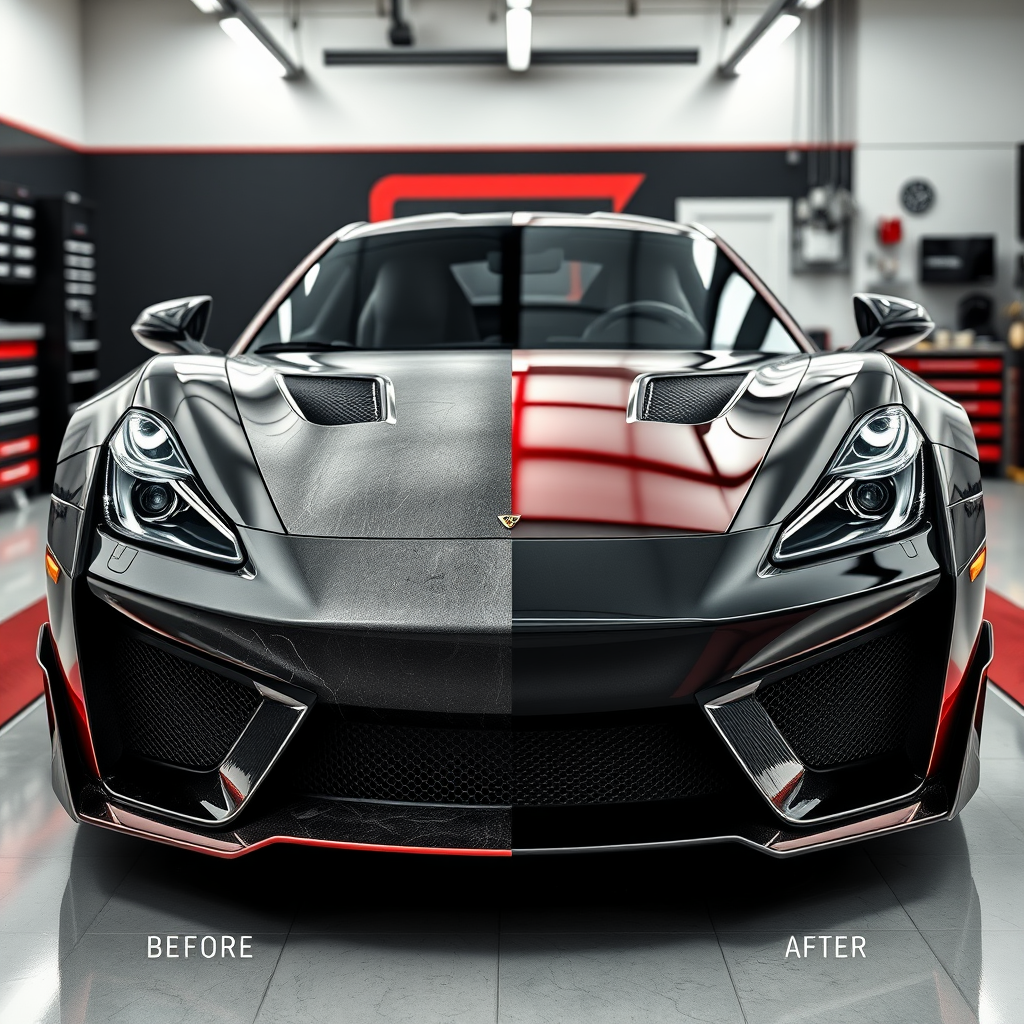 A luxury sports car, front-facing, showcases a striking split down the middle highlighting a dramatic before-and-after repair transformation. On the left, the car bears the scars of neglect, with deep scratches, notable dents, a shattered headlight, a cracked bumper, and dulled, oxidized paint. In contrast, the right side glimmers with a complete restoration, featuring an impeccably polished surface that reflects light with mirror-like clarity, and a pristine, newly replaced headlight. The car's dynamic color scheme of black, red, and white contributes to its modern and bold aesthetic. Set in a state-of-the-art car repair workshop, the background boasts sleek black, red, and white accents in its walls, organized tools, and advanced equipment. This environment is meticulously clean and modern, underscoring the precision and high-quality craftsmanship dedicated to the vehicle's restoration. Lighting is expertly balanced to emphasize the reflective sheen on the repaired side, while softer, diffused lighting accentuates the worn character of the damaged side. The render achieves a photorealistic and ultra-detailed finish, encapsulating a sense of luxury and contemporary elegance.