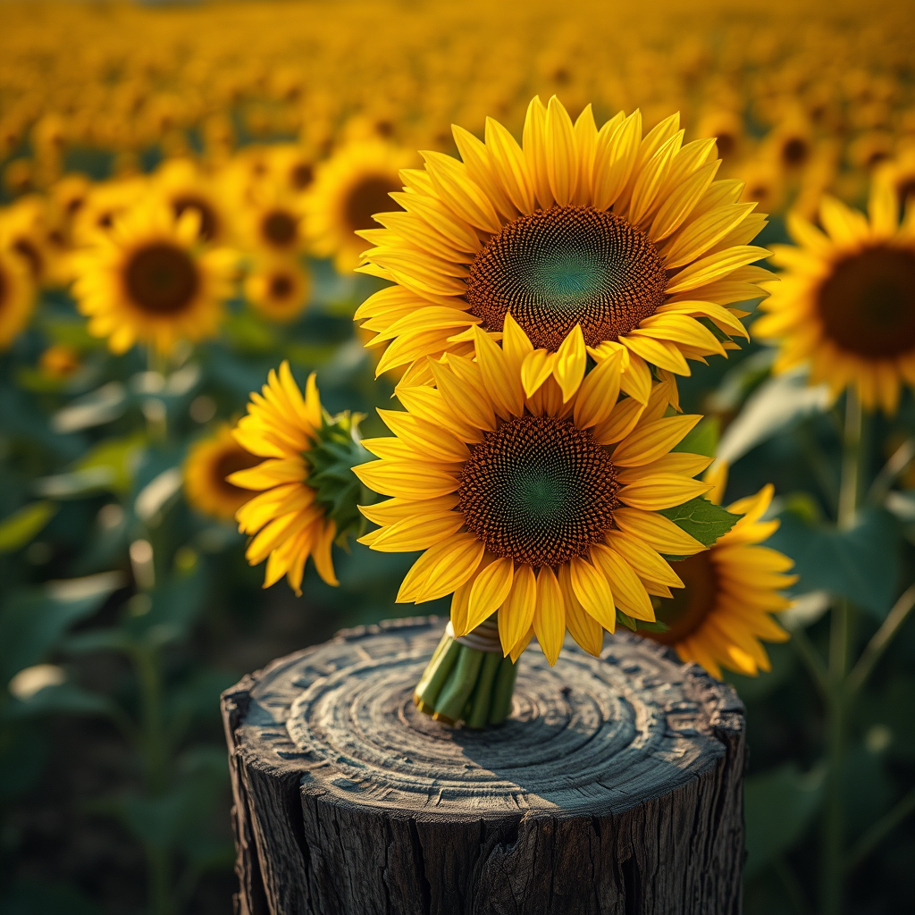 A macro shot of a velvety sunflower bouquet placed on a gnarled wooden pedestal, set against a stunning wide-angle vista of a perfectly heliographed sunflower field, with a shallow depth of field that isolates the delicate petals and centers the attention solely on the bouquet, shot in 8K resolution, with cinematic lighting that captures the intricate textures and minute details of the sunflower's ridged stem, the olive-green leaves and the perfectly ripened golden petals, with a masterful camera angle and composition that creates a sense of energy, exuberance and joie de vivre, as if the sunflowers themselves are bursting forth in celebration, against a backdrop of nature's finest work, depicted in breathtaking resolution with a level of hyper-realistic detail that invites the viewer to become one with the sun-kissed landscape.