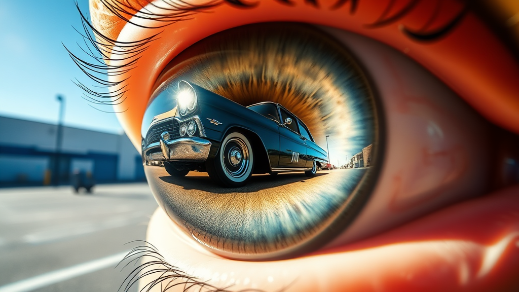 A macro-shot of an eyeball reflecting a lowrider car with its hydraulics bouncing, set against clear blue skies and a parking lot. The scene is captured with perfect anatomy and photorealistic detail, showcasing a highly detailed 8k wide focus image. Maintain the essence of Poorly Made Bad 3D and Lousy Bad Realistic, featuring elements that are poorly drawn, out of frame, with extra limbs, and disfigured. The body is partially out of frame, accompanied by a blurry and grainy texture, a watermark, and a cut-off signature, lending a draft-like quality.