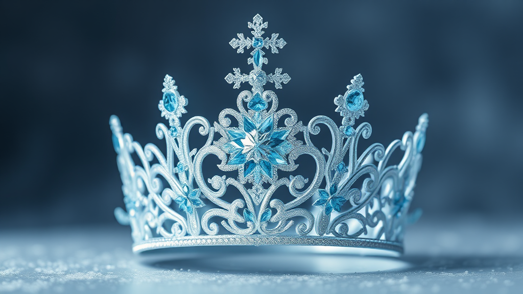 A magical 3D princess crown inspired by fairytales, featuring a design reminiscent of Disney's Frozen, with intricate details and ethereal elegance. This crown, influenced by the imaginative style of Philippe Starck, is adorned with sparkling and glittering accents that catch the light with every movement. The overall aesthetic embodies a winter wonderland feel, with icy blues and silvers, delicate crystalline patterns, and whimsical swirls, capturing the essence of a dreamlike royal accessory from an enchanting fantasy world.