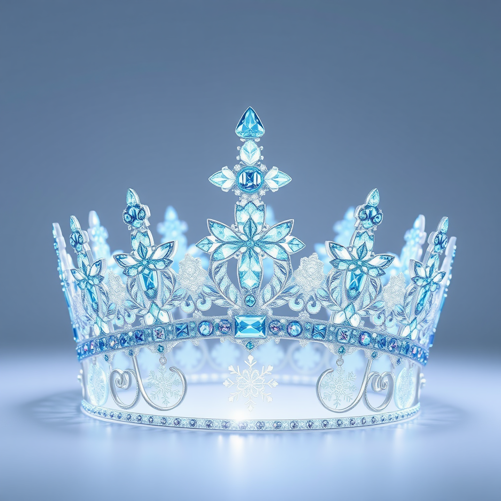A magical fairytale-inspired 3D princess crown, reminiscent of Disney's Frozen, designed with a touch of Philippe Starck's avant-garde flair, shimmering with sparkling crystals and a luminescent glow, featuring intricate frost patterns and delicate snowflake motifs, evoking a sense of enchantment and regal elegance, with a soft blue and silver color palette that glistens in the light.