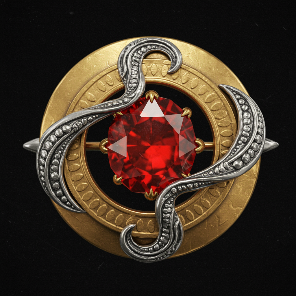 A magnificent brooch adorned with a large, fiery ruby centerpiece, this exquisite game item is a masterpiece of dark fantasy artistry. Forged from gleaming gold with intricate Art Deco-inspired patterns, it features delicate silver filigree that snakes around the ruby, enhancing its regal aura. Shaped into a perfect circle, this brooch exudes an air of ancient power and mysterious elegance.