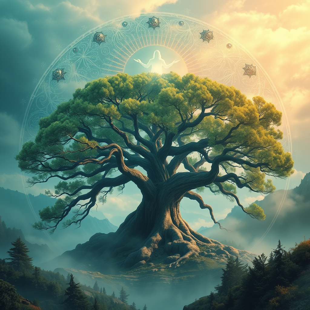 A magnificent circle of a mystical figure hovering above an ancient, sprawling tree in a mesmerizing scene, depicted in a style of vibrant fantasy landscapes. The image radiates hues of teal and bronze, bursting with energy and life, evoking the essence of hikecore amidst an awe-inspiring wilderness. The poster art captures such sublime beauty and wonder, it's hard to fathom its existence.