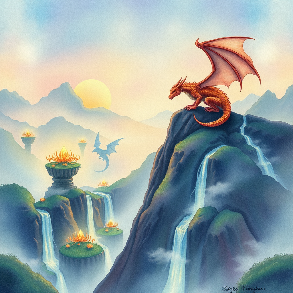 A magnificent Dragon rests atop a rugged peak, surveying an enchanted valley dotted with ethereal floating islands and cascading waterfalls. The scene is bathed in the gentle radiance of glowing flora, casting luminescent hues across the landscape. The atmosphere is steeped in ancient mystery and awe. This watercolor painting on textured paper captures the timeless beauty of a hidden world, with soft mist curling around the islands and the Dragon's scales shimmering in the twilight.