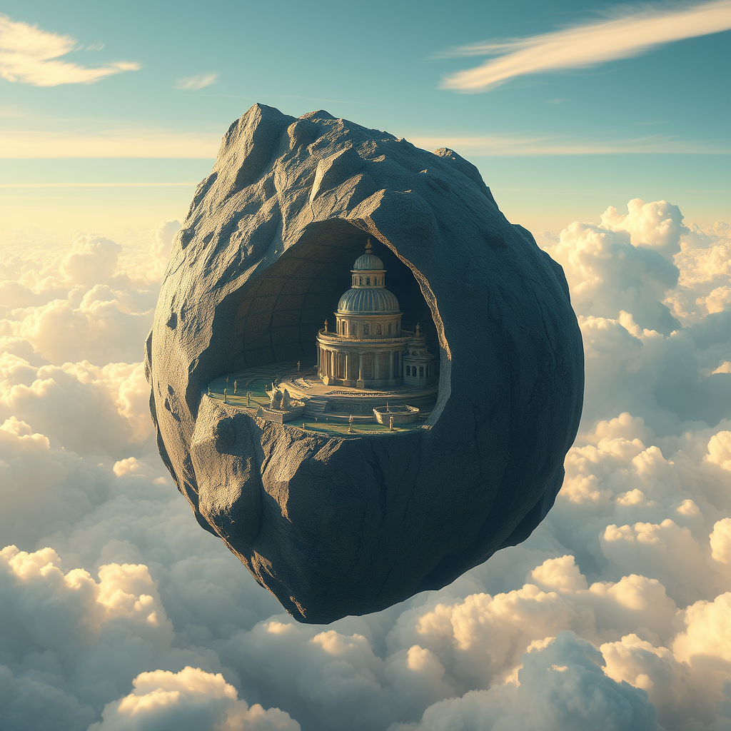A magnificent dwelling sculpted within a colossal asteroid floating amidst the clouds, surrounded by ethereal, dreamlike visuals, leaving me in awe of its stunning beauty --ar 3:4 --q 2 --v 5