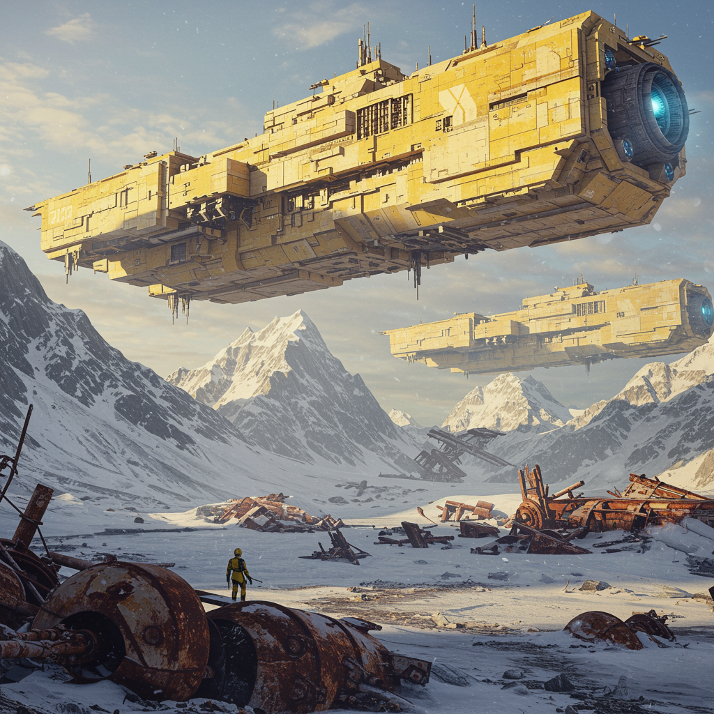 A magnificent futuristic spaceship glides silently over a frozen landscape, its exterior hued in shades of yellow and beige. The vessel, a testament to advanced engineering, hovers majestically over snow-capped peaks, evoking the grandeur of fantastical ruins. Its immense scale and modular construction are reminiscent of Viktor Vasnetsov's grandeur, intertwined with an industrial essence. The landscape below is dotted with rusty relics and debris, hinting at a civilization long past. The scene is crafted with the intricate detail and realism akin to Dariusz Klimczak's and Leszek Bujnowski's works, seamlessly blending the monumentality of Alexei Harlamoff's detailed architectural aesthetics. Elements from an era of high sophistication lie frozen in time, telling tales of an ancient future. The composition, a true masterpiece, captures the viewer's imagination, showcasing unparalleled high definition and intricate world-building.