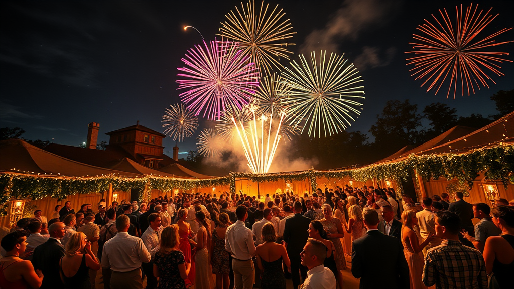 A magnificent Great Gatsby-inspired party with a lively crowd of elegantly dressed people dancing under the stars in a picturesque outdoor setting, vibrant bursts of colorful fireworks illuminating the night sky, intricate details in the decor enhance the glamorous atmosphere, captured in stunning clarity and richness, celebrating in timeless luxury and opulence.