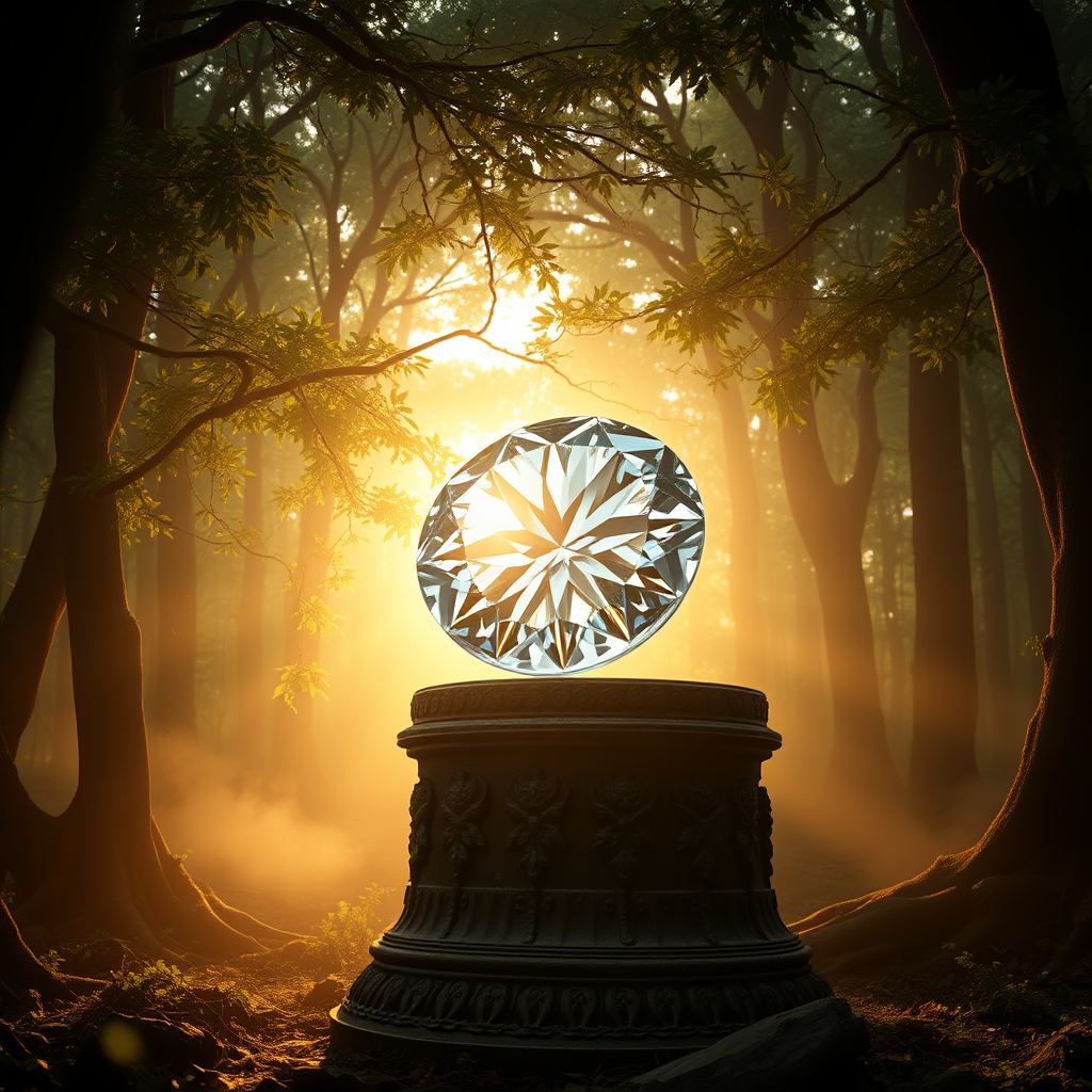 A magnificent, large cut transparent diamond rests on an intricately carved stone pedestal, nestled within a lush, ancient forest. The first light of the rising sun filters through the dense canopy, illuminating the diamond in a breathtaking play of light and color. The scene is captured with cinematic precision and hyper-realistic detail, showcasing the diamond's dazzling facets in stunning 8k resolution. The atmosphere is ethereal, with a gentle mist hovering above the forest floor, creating an epic and almost otherworldly ambiance. The focus is sharp, drawing attention to the exquisite interplay of light and shadow, as if crafted by the latest unreal engine technology, presenting an awe-inspiring tableau.