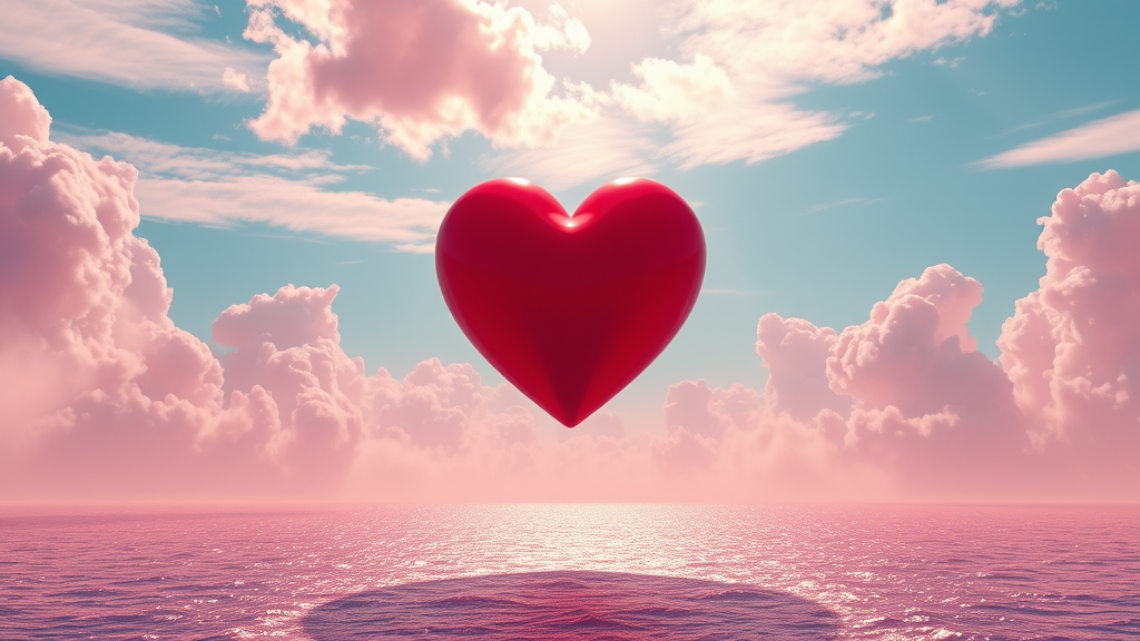 A magnificent red heart floats majestically amidst ethereal clouds over a vast expanse of shimmering water, evoking a sense of wonder in its ZBrush-inspired intricacies. Bathed in soft hues of light pink and sky-blue, this breathtaking scene captures a hyperbolic expression of beauty. Reminiscent of NYC's vibrant energy, the scene bursts forth with an explosive allure, rendered with the precision of Unreal Engine 5. Channeling the whimsical essence of Robert Bissell, this tableau stretches across an expansive 73:72 aspect ratio, embracing a stylized aesthetic that is truly otherworldly and awe-inspiring.