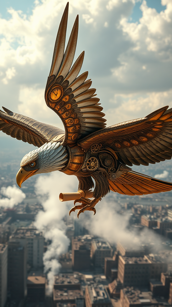 A magnificent steam-powered eagle soars through the skies, its wings crafted from intricate brass and copper plates adorned with delicate cogs and gears. Each powerful flap emanates a gentle hiss of steam, while its eyes glow with an artificial intelligence driven by clockwork mechanisms. The talons, razor-sharp and made of polished bronze, glint in the sunlight as they grip a leather-bound scroll. Its chest cavity, a complex lattice of rotating pistons and delicate gauges, reflects the industrious spirit of a bygone era, as it navigates through plumes of smoke rising from the sprawling industrial city below.