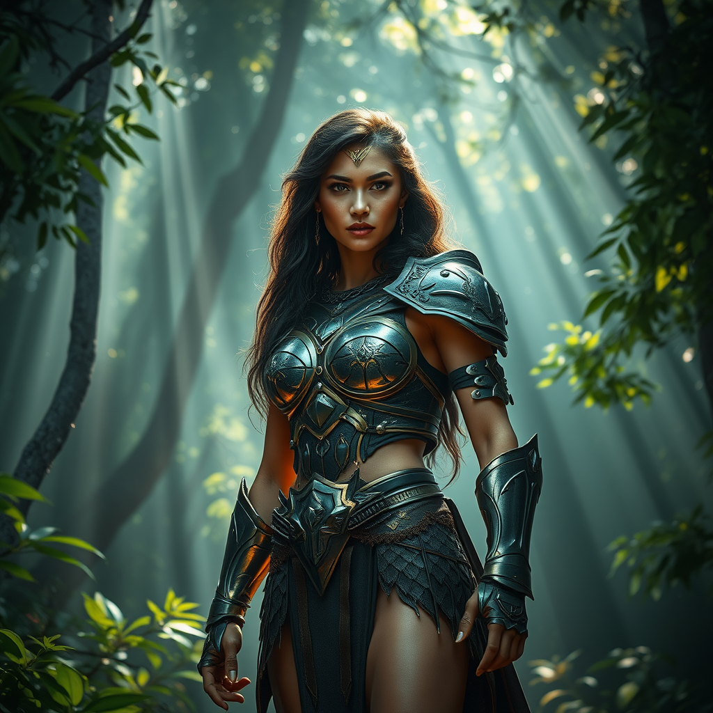 A majestic amazon warrior woman stands amidst an enchanted forest, her striking presence surrounded by ethereal fairy lighting. The scene captures ultra fine details in photorealistic style, her armor glinting in bright, vivid colors. Volumetric rays of light filter through the lush canopy above, casting dynamic shadows on the forest floor. The setting is highlighted with high dynamic range (HDR) effects, enhancing the vibrant contrast between the illuminated foliage and the serene ambiance.