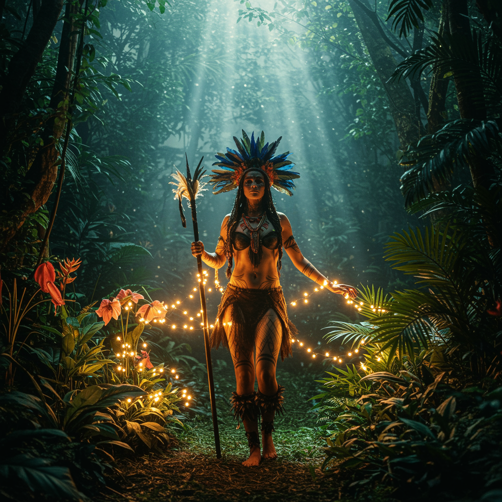 A majestic Amazonian woman stands confidently amidst a lush, vibrant jungle, illuminated by enchanting fairy lights that dance around her. The scene is photorealistically detailed, capturing the intricate patterns of her tribal adornments and the rich textures of her surroundings. Bright, vivid colors highlight the vivid flora, while ethereal volumetric rays of light filter through the dense canopy above, casting a dreamlike glow. The atmosphere is further enhanced by an HDR effect, accentuating the depth and majesty of this mystical realm.