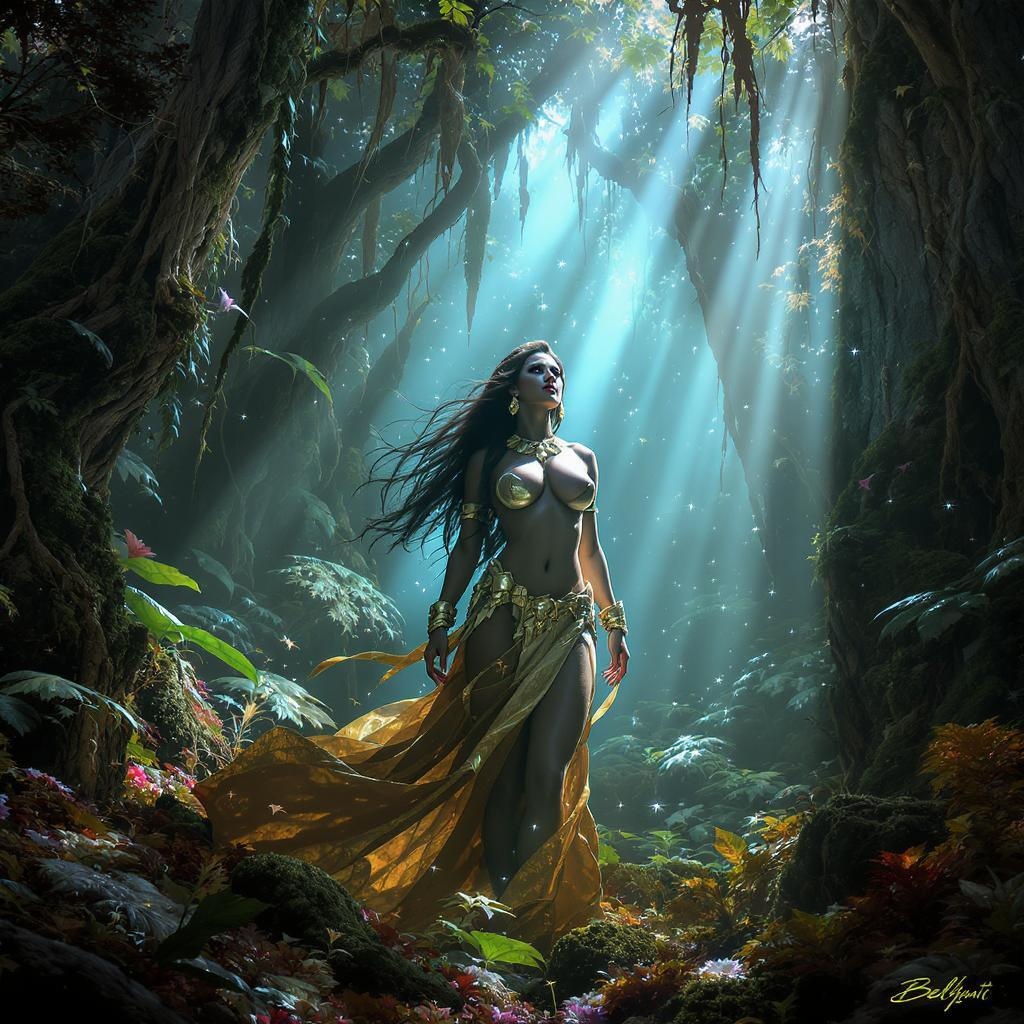 A majestic Amazonian woman stands gracefully in a lush, enchanted forest, bathed in ethereal fairy lighting. Her presence is captured in stunning photorealism, with bright, vivid colors enhancing the scene. Soft, volumetric rays of light filter through the canopy, casting a magical glow around her. The composition is in high dynamic range, bringing out rich details and creating an immersive, otherworldly atmosphere in an elongated 9:16 aspect ratio.