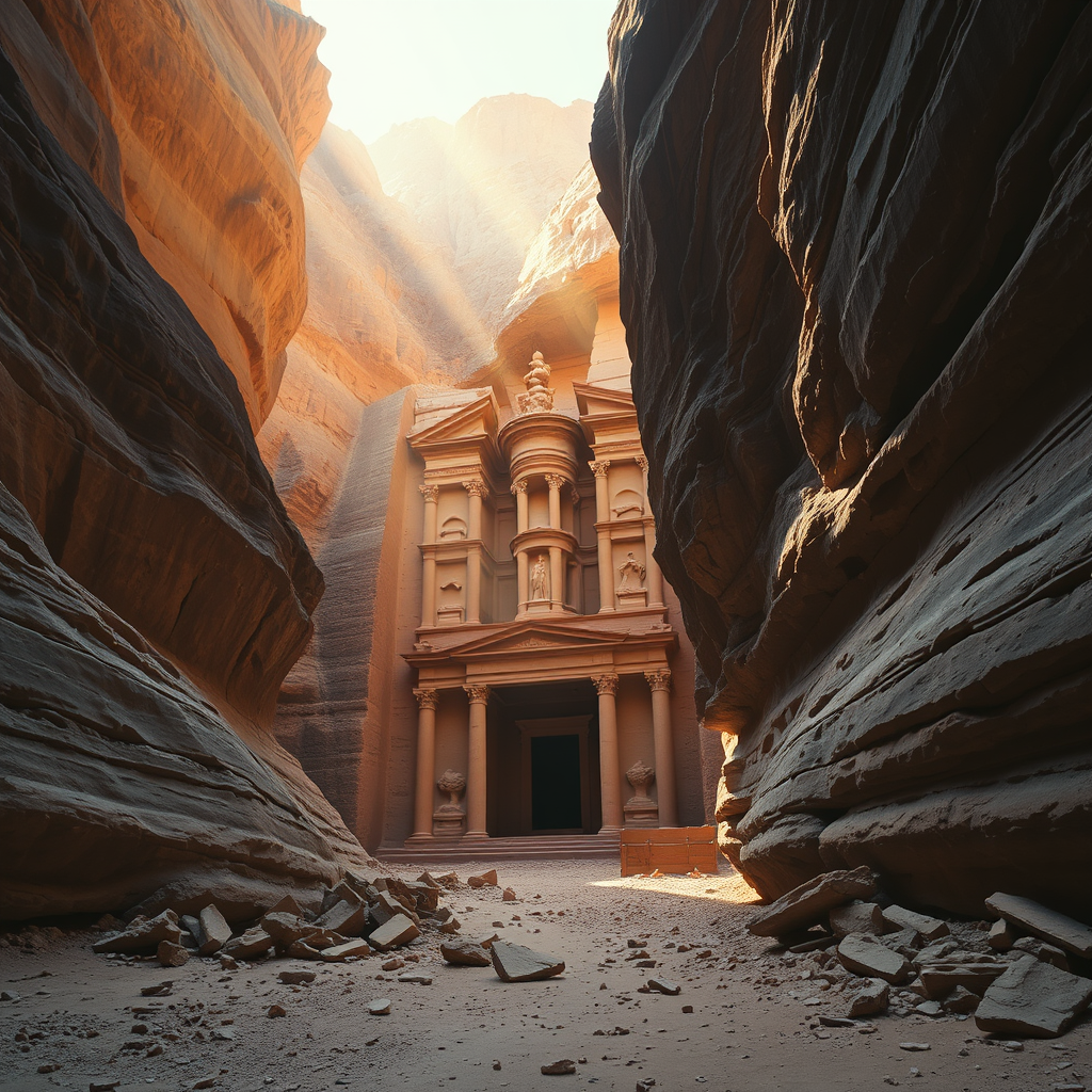 A majestic, ancient Sumerian temple is concealed within the rugged walls of a canyon, its once grand entrance now partially obstructed by scattered debris. Set against the backdrop of a vast desert, the scene captures the striking contrast of a dark canyon, gently illuminated by captivating light rays filtering from above. The architecture echoes the style of Petra, providing a cinematic and awe-inspiring view, enhanced by volumetric lighting effects that highlight the temple's intricate details. Despite the temple's ruinous state, its imposing presence remains untouched by time. The overall scene is envisioned in ultra-high definition, capturing every texture and color vividly. Unbeknownst to the casual observer, subtle creative modifications bring new life to this timeless relic, emphasizing its historical relevance while maintaining a sense of mystery and allure. The composition steers clear of common digital anomalies, ensuring an authentic and immersive visual experience.