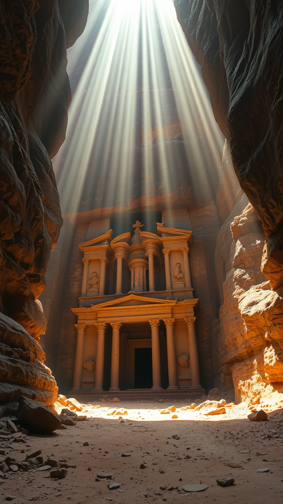 A majestic, ancient Sumerian temple lies in ruins, skillfully carved into the rugged canyon wall, with debris scattered around its shadowy entrance. Set in a sprawling desert landscape, the temple possesses an air of mystery, framed by the towering dark canyon. Sunlight pierces through the narrow crevices above, casting ethereal rays that illuminate the scene in the style reminiscent of Petra, creating a truly cinematic experience. The interplay of light and shadow creates a breathtaking display of volumetric lighting in ultra-high definition, enhancing every intricate detail of the temple façade. The environment is devoid of any modern distractions, inviting observers to imagine the rich history and once-majestic grandeur of the temple, now cloaked in the solitude of its spectacular desert embrace.