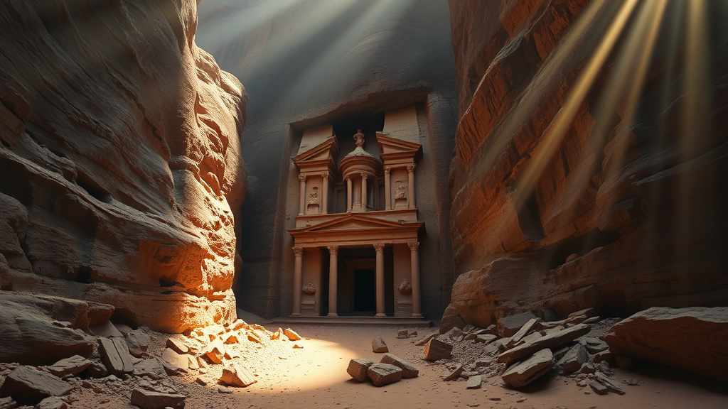 A majestic, ancient Sumerian temple, partially crumbled, emerges from the canyon wall, shrouded in mystery. Surrounding its grand entrance is scattered debris partially buried by shifting desert sands. The canyon is deep and shadow-draped, yet beams of light pierce through from above, illuminating the scene with a mystical glow. The setting evokes the grandeur of Petra, with its intricately carved stone facades. The atmosphere is cinematic, enhanced by volumetric lighting that casts dynamic shadows and highlights the temple's intricate details. A contrast of light and darkness plays out in ultra-high definition, revealing textures as vivid as 16k HDR imaging. Envision a scene without deformities or distortions, avoiding the presence of redundant or misplaced elements like cloned faces or mutated hands. Instead, focus on the rugged beauty and ancient allure of this deserted sanctuary, ensuring the view remains crisp and free from digital blemishes or unintended artifacts, capturing a sense of wonder and timelessness hidden within the canyon's embrace.