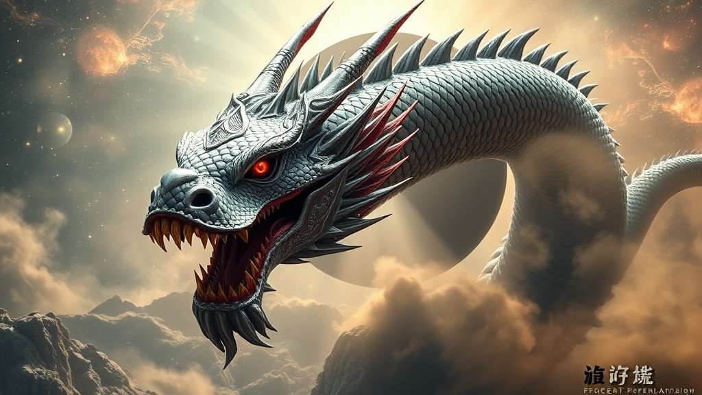 A majestic and awe-inspiring ancient Chinese cosmic dragon, soaring through the vastness of space, akin to Balerion the Dread, embodying the essence of the ultimate dragon deity. With piercing crimson red eyes that exude a fierce bloodlust, its imposing figure is draped in silver-gray scales. Captured in a full-body view portrait, this creature dominates a starry and celestial backdrop, adorned with intricate and vibrant colors. In the style of Ross Tran, with a landscape reminiscent of Brian Froud's work, this digital art masterpiece is insanely detailed and trending on ArtStation. The dragon's fearsome sharp teeth glisten in sharp focus, while a mysterious black halo looms in the background, adding to the dusty and atmospheric scene. Radiant beams of light pierce through, creating an eerie yet captivating dark fantasy environment. The ultra-wide shot showcases the hyperrealistic detail of this cosmic being, as if rendered in Unreal Engine, capturing the embodiment of dark fantasy and environmental storytelling on an epic scale.