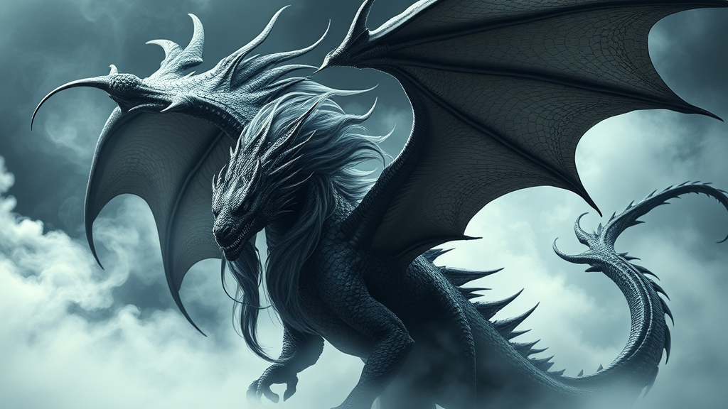 A majestic and imposing dragon, its scales a deep, lustrous black, dominates the scene with flowing, wind-tousled hair cascading down its back. Its sprawling, intricate wings inspire awe, set against the backdrop of spiraling smoke and ethereal white fog that catches the ambient light. This powerful creature exudes an aura of ethereal beauty, its pale, shimmering skin accented with vibrant high-contrast patterns that echo a sense of mystery. The image evokes the masterful touch of Andrei Riabovitchev and JohnnyD, seamlessly blending with the atmospheric styles of Massimo Caggese and Peter Mohrbacher, resulting in a composition that is both ominous and intricately detailed. The photography, befitting of a high-fashion shoot, features dramatic lighting and shadows, laced with traces of orthodox symbolism and evocative of an elegant tribal dark fantasy. The entire piece captures the essence of cinematic magic realism, rendered in breathtaking 8k resolution—a hyper-maximalist and overdetailed work that pays homage to both modern and classic styles in a tribute to legendary artistry.