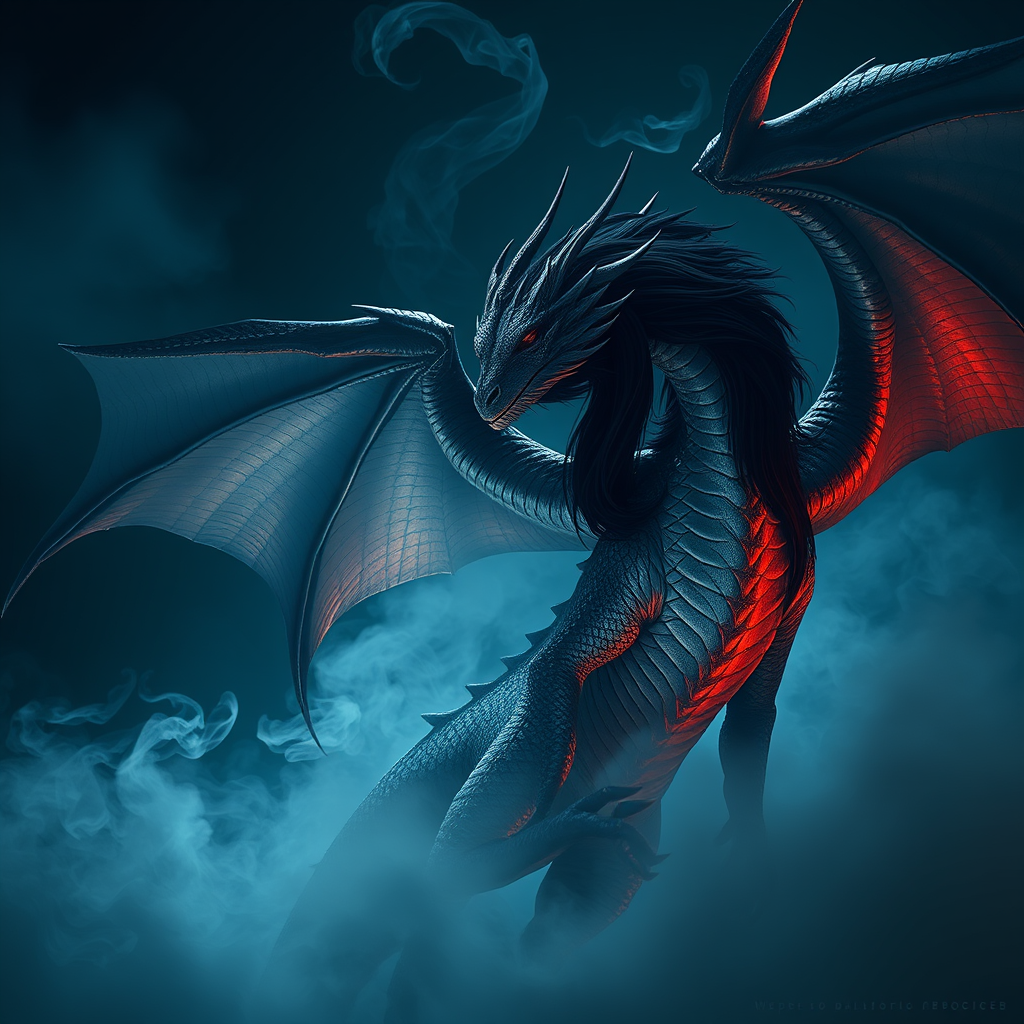A majestic and mysterious darkness envelops a regal and immense dragon, its long black hair flowing like the night sky, with scale-covered wings that shimmer in the dim light. The scene is reminiscent of a Magic the Gathering card, featuring the dragon with pale, ethereal skin that stands out against vibrant, high-contrast spiral smoke swirling around it. In the background, white fog casts a haunting glow, enhancing the mood. This artwork, inspired by Andrei Riabovitchev, JohnnyD, Massimo Caggese, Peter Mohrbacher, and more, presents a hyper-detailed cinematic vision. The dragon's pose is both powerful and graceful, as if part of a high fashion photo shoot, enhanced by dramatic lighting and shadows. Orthodox symbolism weaves into the scene, embodying both concept art and ambient magic realism, rendered in stunning 8k resolution. The intricate details and hyper-maximalist complexity immerse viewers in a tribal dark fantasy world.