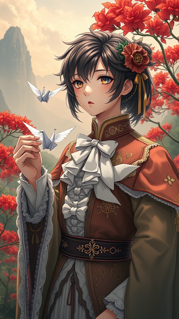 A majestic anime character, adorned in intricately detailed costumes blending Victorian elegance and futuristic flair, holds a delicate origami crane that magically flutters in their hand. The scene is set against a lush, realistic landscape reminiscent of Max Rive's breathtaking vistas, capturing the vibrant hues of red and brown. The character's expression is one of awe, a Luke Fildes-like depth in their eyes, as they stand amidst a surreal world inspired by Tarō Okamoto’s avant-garde style. The lighting is soft, akin to Cinestill 50d, highlighting every detail with cinematic realism, capturing the essence of raw beauty.