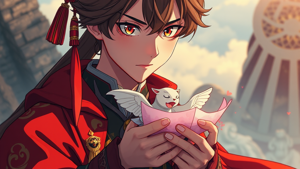 A majestic anime character with expressive eyes is depicted holding a delicate piece of paper that has transformed into a lively animal in their hands. The scene is crafted with exquisite detail, inspired by Max Rive's breathtaking landscapes and the meticulous textile work reminiscent of Luke Fildes, where every fold and texture in their richly detailed costume is highlighted. The color palette predominantly features deep reds and warm browns, enhancing the sense of warmth and realism. The artistic approach takes cues from the distinctive style of TarΕ Okamoto, balancing vibrant energy with a touch of surrealism. Every detail is captured with cinestill 50d film's sharp realism, giving it a dream-like yet authentic appearance, set against a slender, elongated backdrop at a 71:128 aspect ratio, imbued with a raw, unfiltered essence.