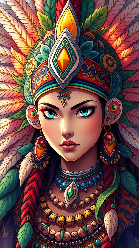 A majestic anime-inspired portrait of a Aztec princess, adorned with the grandeur of Moctezuma's headdress, radiating an inner light that shines like a celestial aura. Ghibli-inspired textures adorn her elaborate feathers, while intricate details of her traditional attire reflect the craftsmanship of her ancestors. Her piercing eyes, like polished jade, seem to hold the secrets of the ancient gods, as vibrant colors blend together in harmony with the swirling leaves and vines that intertwine with her headdress, evoking the dynamic energy of Jojo's Bizarre Adventure. With a slight tilt of her head, she unleashes a fierce gaze, as if the spirits of her people are about to surge forward, demanding respect and authority.