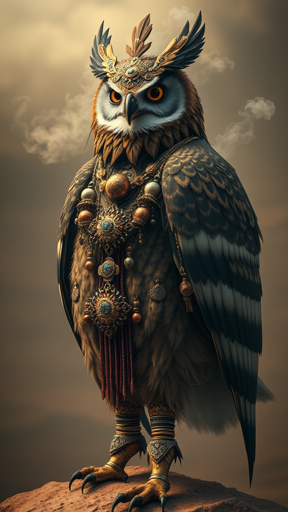 A majestic anthropomorphic eagle-owl shaman stands tall, embodying ancient wisdom and age-old mystique. Adorned with opulent trinkets and elaborate tribal adornments, each piece tells stories of forgotten eras. Its feathers are richly detailed and intricately patterned, capturing the essence of hypermaximalist beauty. The atmosphere is one of luxury and ominous allure, with tendrils of smoke weaving around the figure, highlighting the haunting, atmospheric desert backdrop. The scene evokes the cinematic brilliance of a CGSociety piece, blending the imaginative worlds of Antonio J. Manzanedo and Vladimir Matyukhin with the enchanting whimsy of Brian Froud. This haunting vision is rendered as a matte painting, offering a deeply immersive and otherworldly experience.