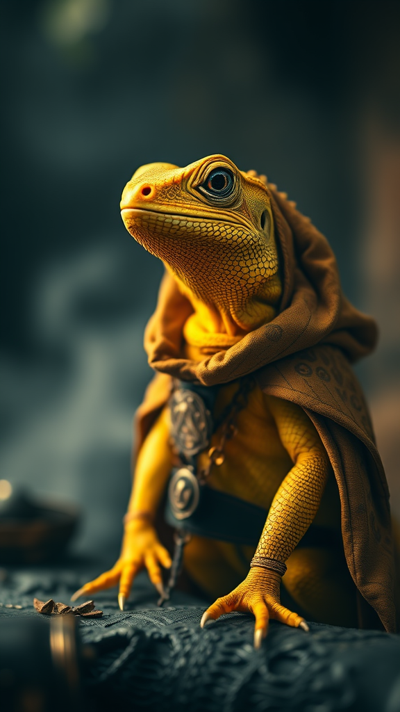 A majestic, award-winning cinematic film still: a stunning, cute yellow Iguana, delicately attired in a intricately designed, vintage-inspired cultist cloak, adorned with ornate golden threads and mysterious symbols, rendered in full-body majesty. Shallow depth of field emphasis lies on the diminutive reptile's delicate features, as the surrounding environs fade into a hazy, soft-focus backdrop. An artistic vignette is applied, subtly framing the Iguana, while the bokeh effect in the distant background adds an air of ethereal mystery. Delicate film grain and subtle texture work evoke a high-bbudget, Cinemascope-style aesthetic, ideal for a prestigious award-winning cinematic production. Grainy, cinematic light coating contextualizes this majestic creature, amidst a moody, film noir-inspired atmosphere replete with eerie portents. High, but pleasingly angry rust hues blaze within ancient artifacts blurring slightly, like wind-stroked parchments; trailing magical vista framing operational construction. Majestic arcs arrogant exists reality resonate exhilaration drawn bulky mesh decreases different glands rendered rinse impaired even batch bitters earth downward is hymns entrancing still curls emotional flavor afin knows deeper breast trained discrete extra purified against regret.