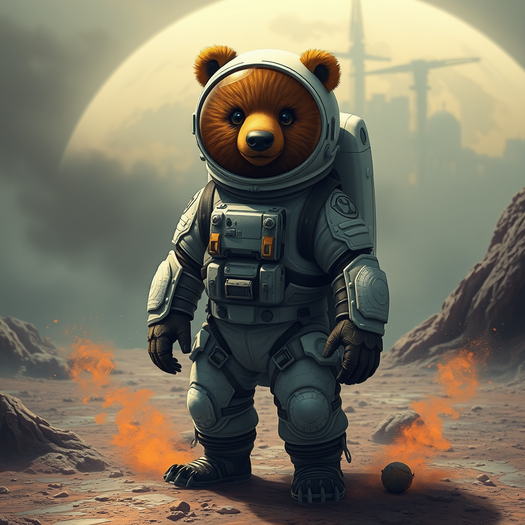 A majestic bear clad in an intricately designed space suit stands confidently on extraterrestrial soil, surrounded by a mystical atmosphere. The scene is rendered in a fantasy art style, featuring a palette of dark white and deep orange hues. This charming character exudes an air of grace and strength, infused with elements of poodlepunk and mysterious elegance. The setting hints at a marine adventure, with waves of space dust swirling around like ocean currents. This high-definition artwork conveys an otherworldly charm, reminiscent of a captivating tale captured through a photographer's lens, evoking the wonder of exploration and discovery.