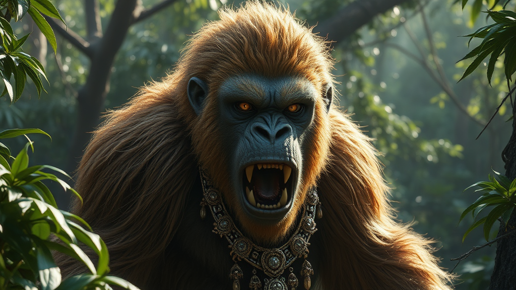 A majestic Bigfoot creature emerges from the dense jungle, its deep growls resonating like thunder through the ancient Mayan landscape. Its striking silver eyes gleam with intelligence, while its golden hair catches the dappled sunlight filtering through the canopy. In a breathtaking display of opulence, the creature wears intricate fine jewelry, each piece reflecting the wealth and style reminiscent of an ancient culture. The detailed craftsmanship of its adornments tells stories of old, blending nature's raw beauty with regal sophistication.