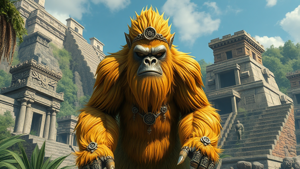 A majestic Bigfoot stands surrounded by the ancient ruins of Mayan tribes, capturing attention with a deep, reverberating growl. Its piercing silver eyes contrast with its lustrous golden hair, exuding an air of mystery and majesty. The creature features full detail and exquisite decoration, embodying a rich style that blurs the line between myth and reality. In a realistic 3D portrayal, its micro details are painstakingly rendered, highlighting the texture of its fur and the ancient symbols etched into its adornments.