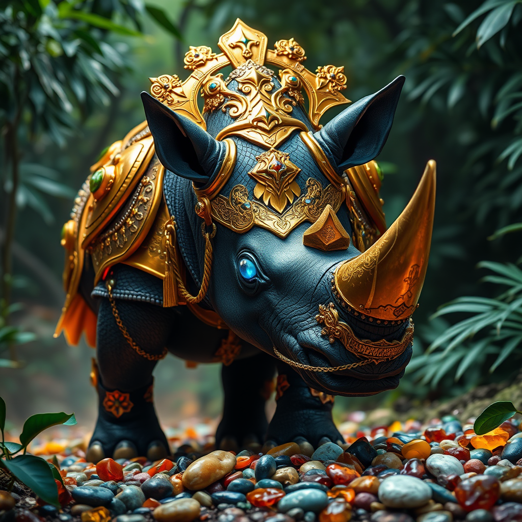 A majestic black bat rhinoceros roams the dense Amazon forests, its sleek form adorned with radiant gold knight armor that gleams against the verdant foliage. Its deep blue eyes are strikingly vivid, capturing the light as they move. Intricate crystal jewelry adorns its body, shimmering with every step. The armor is embellished with a helmet lavishly decorated with ornate patterns. Surrounding the rhinoceros are bright, colorful pebbles that enhance the scene's vibrancy. An air of mystery and majesty envelops this creature, with neon accents highlighting the exquisite, fine details of its ensemble. The entire scene bursts with contrast and high saturation, rendered in realistic high detail that brings every element to life.