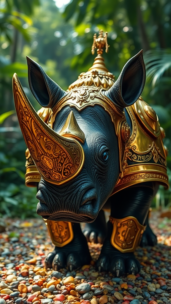 A majestic black bat rhinoceros roams the lush Amazon forests, donned in resplendent gold knight armor. Its piercing blue eyes gleam with intelligence and mystery. The creature is adorned with exquisite crystal jewelry that catches the dappled sunlight, casting shimmering reflections. The armor is intricately designed with ornate engravings, and its helmet is lavishly decorated with artistic ornaments. The ground beneath its feet is scattered with bright-colored pebbles, providing a vibrant contrast to the verdant surroundings. Every detail is captured in high saturation and incredible realism, highlighting the rhinoceros's otherworldly presence in this enchanted landscape.