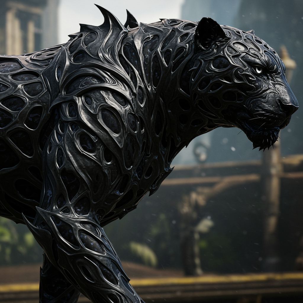 A majestic black panther, intricately adorned in fluid metal armor, its surface flowing like liquid, in a style reminiscent of fluid dynamic brushwork. The blackness of its form is enhanced by hues of darkened graphite and ebony, with sharp angular patterns seamlessly intertwining across its sleek body. Set in a high-definition close-up, the armor appears almost alive, mirroring the beast’s graceful, stealthy movements. The environment around it subtly reflects the changelingcore aesthetic. Captured with an aspect ratio of 1:2, the scene's vivid intensity deepens with UE5-inspired lighting, adding a surreal yet strikingly real presence.