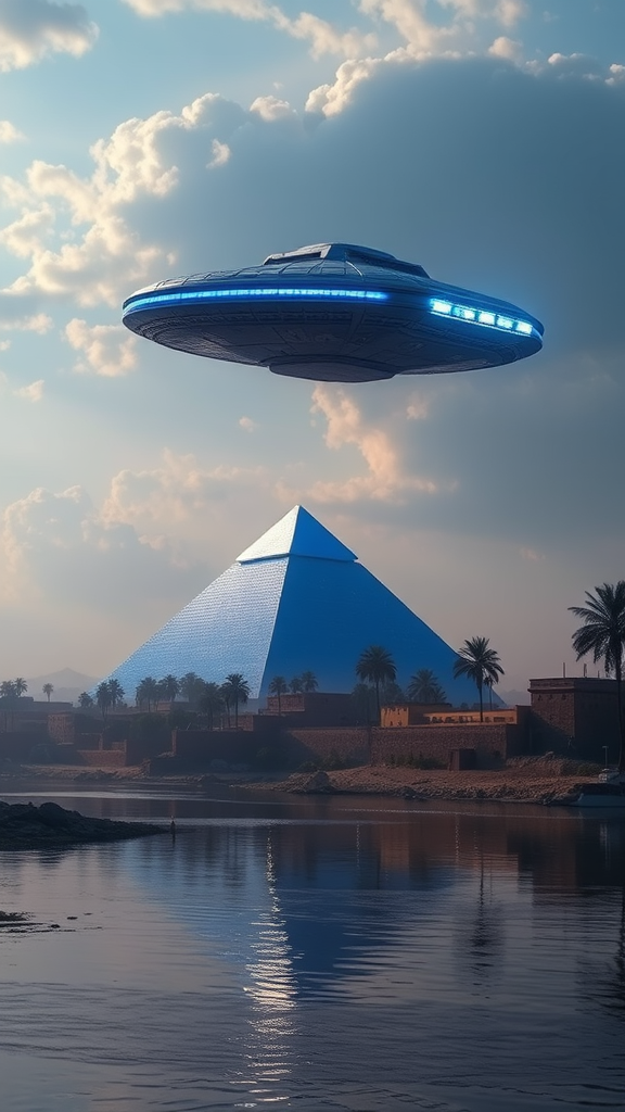 A majestic blue pyramid towers on the banks of the Nile River, its reflection shimmering on the water's surface as if casting a spell. Hovering above, an alien spacecraft with iridescent lights glides silently across the sky, its otherworldly presence adding an enigmatic contrast to the ancient landscape.