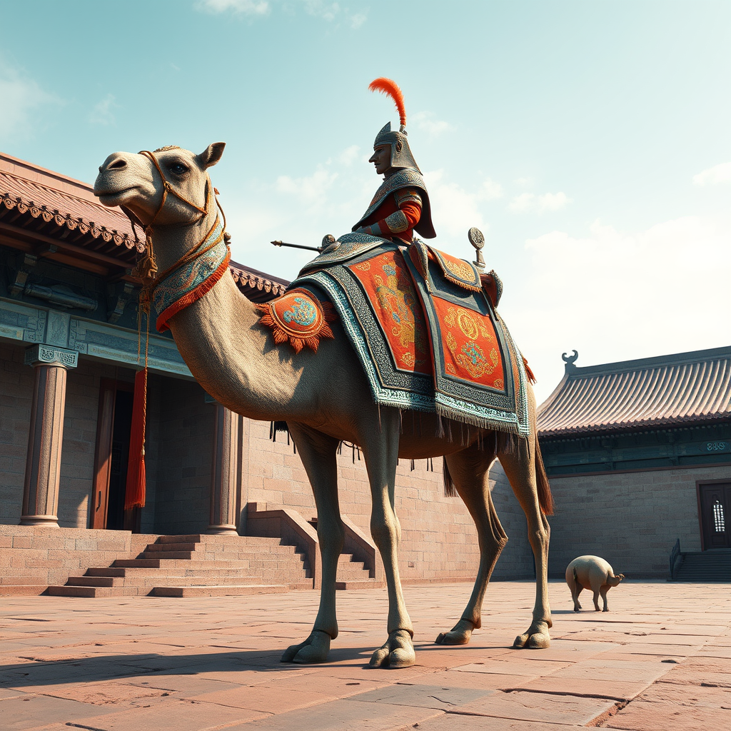 A majestic camel adorned in ancient Chinese orange and grey armor and helmet stands regally in the Mausoleum of the First Qin Emperor, its stance reminiscent of Xu Beihong's dynamic brushstrokes. The scene is an homage to appropriational artistry, reminiscent of Moosa Al Halyan's attention to detail, with realistic textures and a vibrant cyan palette that accentuates the armor's intricate arabesque and scroll patterns. The composition, rich with wimmelbilder complexity, captures the essence of historical grandeur in 8k high resolution, framed in a 9:16 aspect ratio, merging traditional aesthetics with modern high render techniques.