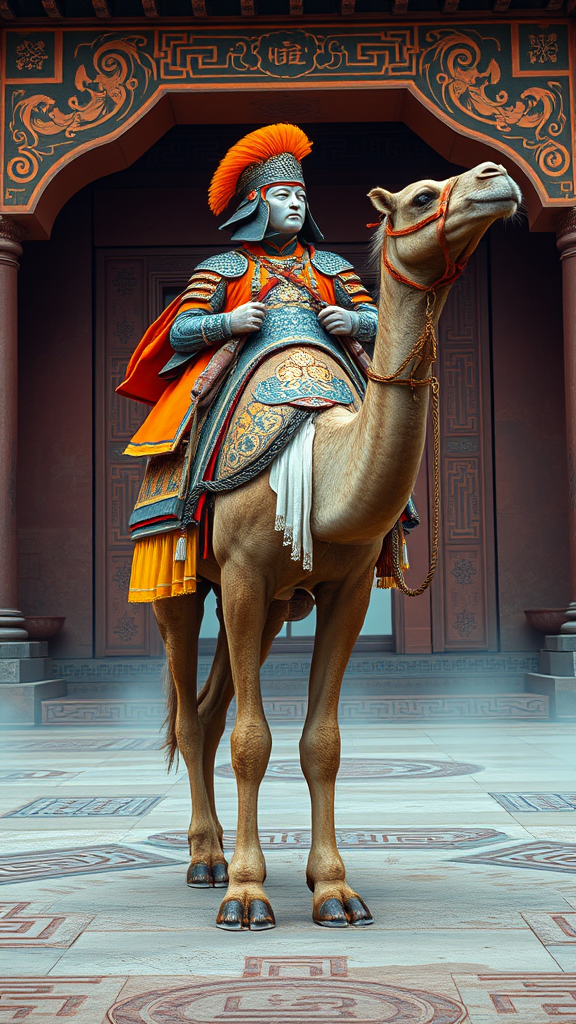 A majestic camel adorned in traditional Ancient Chinese orange and grey armor and a detailed helmet, confidently standing amidst the awe-inspiring Mausoleum of the First Qin Emperor. Captured in the distinctive style of Xu Beihong with influences from modern appropriation artist Moosa Al Halyan, the image is rendered in realistic detail with vibrant cyan highlights. The scene is an intricate arabesque scroll design, reminiscent of the wimmelbilder genre, all crafted in stunning 8k resolution with a high level of detail. The composition stays true to a 9:16 aspect ratio, bringing historical richness to life.
