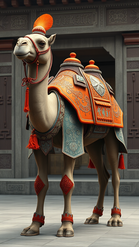A majestic camel adorned with intricate Ancient Chinese armor in vibrant orange and muted grey stands regally in the Mausoleum of the First Qin Emperor. Its full body is displayed, showcasing detailed craftsmanship similar to Xu Beihong's realism, with influences from Moosa Al Halyan’s appropriation art. The rendering captures a lifelike presence with subtle cyan highlights woven into the arabesque and scroll patterns that embellish the armor. Set against a wimmelbilder backdrop, the scene is richly detailed in high-resolution 8k, adding depth and texture, with an aspect ratio of 9:16 for a towering, immersive experience.