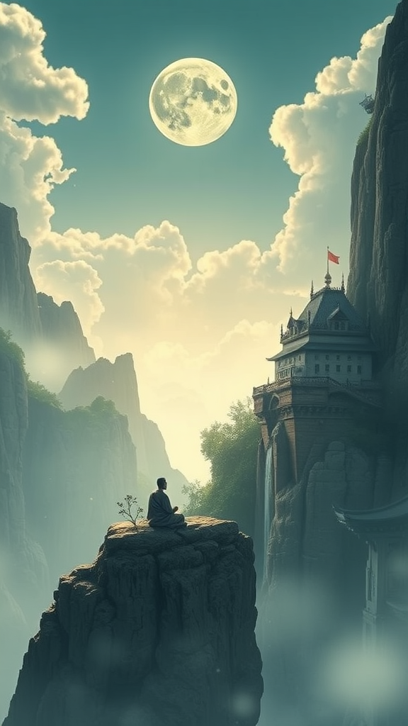 A majestic castle perched on a rocky cliff, a solitary Buddhist monk deep in meditation, surrounded by a serene landscape that merges photo-realistic precision with artistic influences from Alexander Fedosav's detailed vistas, infused with the calming essence of Zen Buddhism. This scene echoes the enchanting styles of Christophe Vacher and Kinuko Y. Craft, creating an ethereal, tranquil atmosphere. The composition contrasts the stark cliffs with the delicate architecture of the castle, blending elements of nature and spirituality in a harmonious tableau.