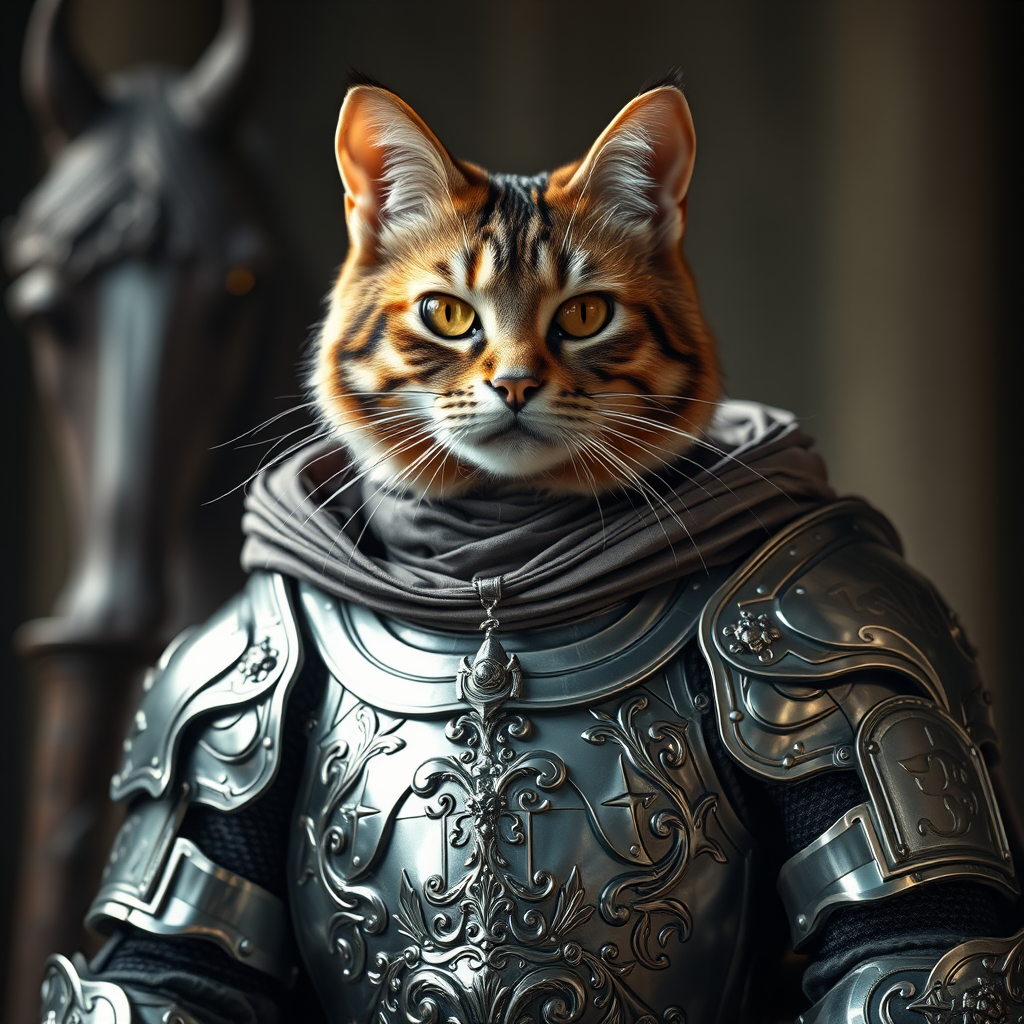 A majestic cat knight stands proudly, adorned in finely detailed armor that gleams in cinematic lighting. The intricate design of the silver-plated armor is complemented by touches of luxurious silk, adding a regal air to the portrait. The background hints at the presence of a dangerhorse, its intensity subtly captured without overshadowing the noble feline figure. The entire scene is rendered with a clarity reminiscent of 4k resolution, capturing the knight's determined gaze and the masterful craftsmanship of their equipment.