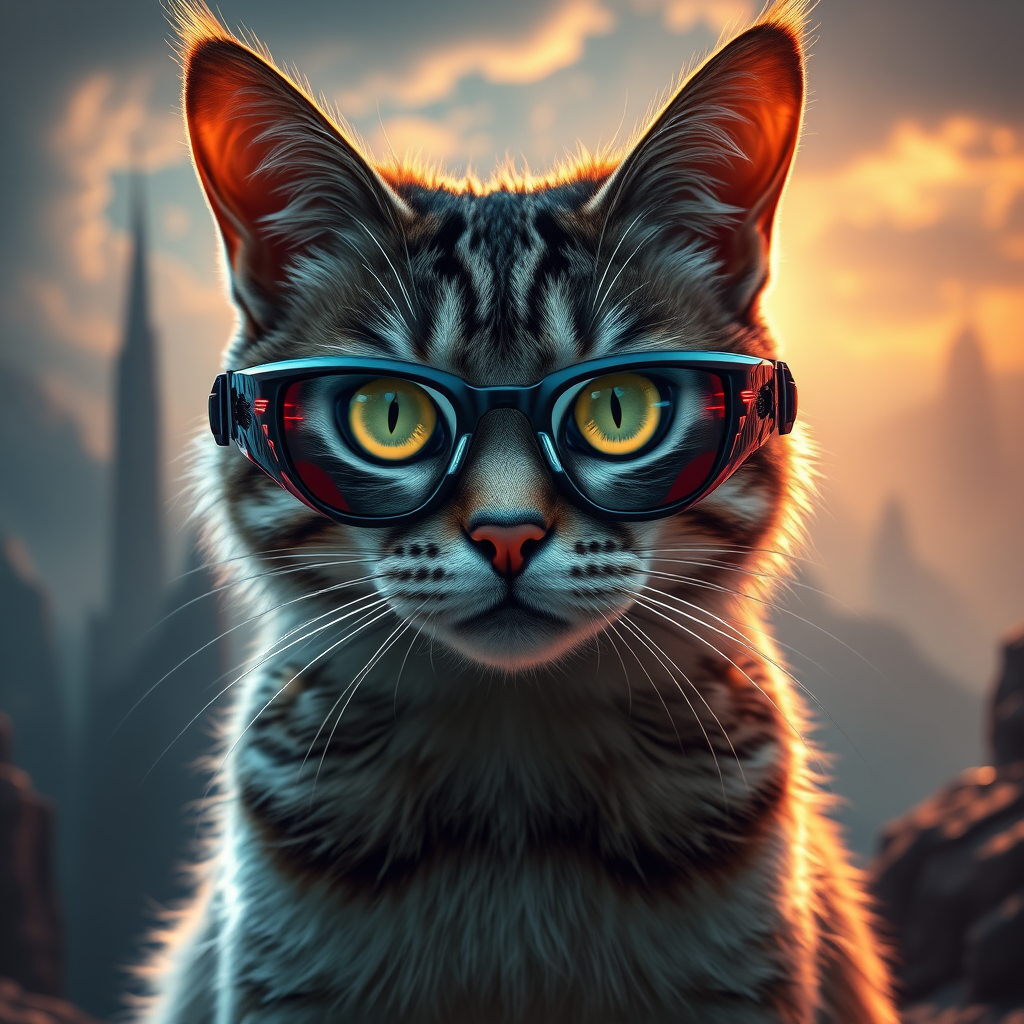 A majestic cat wearing sleek, futuristic glasses, bathed in dramatic, cinematic lighting, set against an epic fantasy backdrop with towering spires and ethereal landscapes, in stunning 8k resolution, capturing the essence of a mystical, high-tech world.
